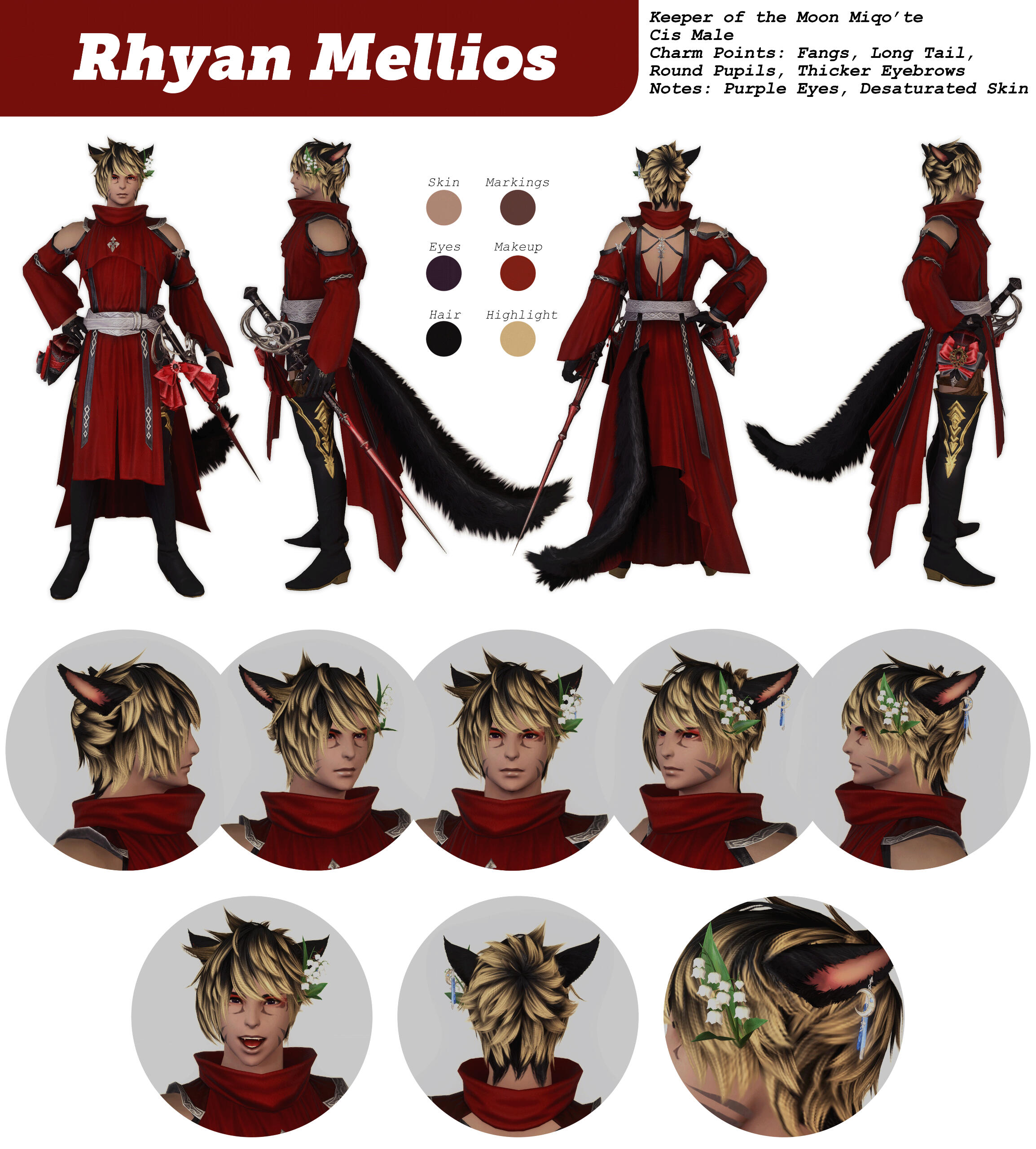 Nowadays Rhyan is a field researcher for the Arcanist Guild on contract. He is considered a specialist in Theoretical Aetherology and Aetherical Anomalies, especially with tears to other realms, voidsent influence, and remnants of ghosts and other spectres. He is also gifted with divination, and his echo often manifests in visions of things yet to come.As his day job he moonlights as a playwright for his travelling theatre troupe the Goobbue Gang Theatrics Association, but in actuality uses the time in between legitimate missions as a vigilante red mage adventurer with the GGTA being many of his closest allies in his missions.After researching the remains of Mhach, he came across a tome recounting the tales of red magic past, and he has been studying its arts and history since. He's met other students of the ancient arts in his travels, but not many. The sword has fit more naturally into his hands than he thought it would.While his guild and close friends know about the secret adventuring he does as a Red Mage, his family and more casual friends are none the wiser. On the job, Rhyan wears a mask to conceal his true identity, magically enchanted to keep away otherworldly influences and to muddle the thoughts of strangers to not recognize any of his defining features.♦